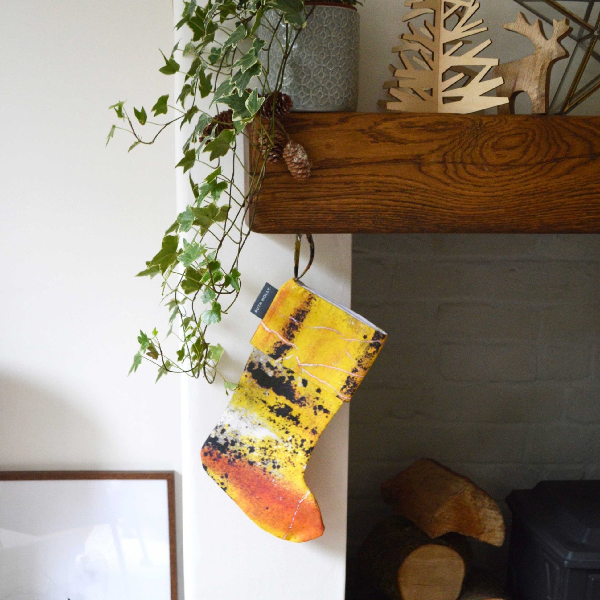 This stunning one-of-a-kind Handmade Christmas Stocking is named The Nomad Texture ‘Orange Toe’ as it has a flash of deep orange on the foot. Featuring rich yellow, golden ochre hues, and charcoal black details on both sides. Such a modern twist on a truly traditional keepsake, fun and fresh for the ultimate contemporary Christmas decor. Perfect to hang on the mantlepiece, or as a decorative festive accessory.